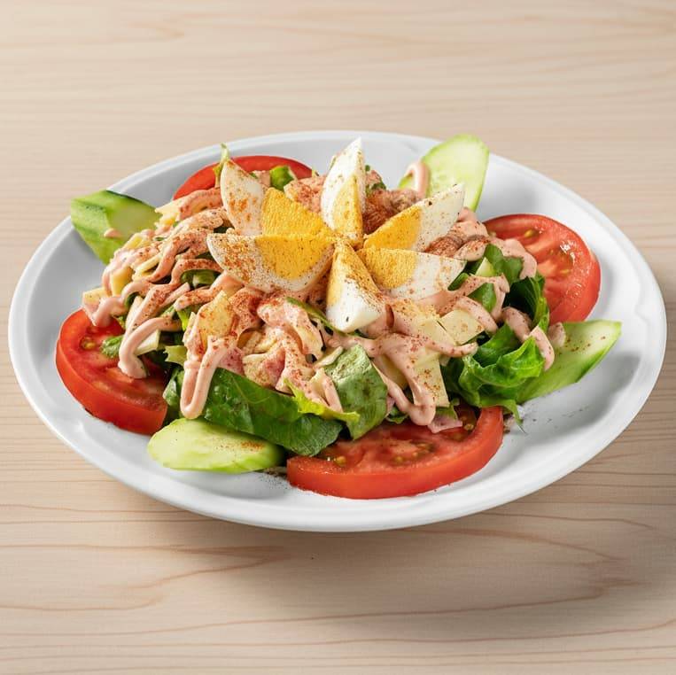 Σαλάτα με ντομάτα, μαρούλι, αυγό βραστό, edam, ζαμπόν & cocktail sauce.