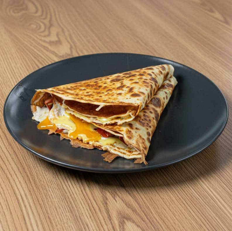 Με μετσοβόνε, μπέικον, λουκάνικο Φρανκφούρτης, αυγό μάτι & Caesar`s sauce.