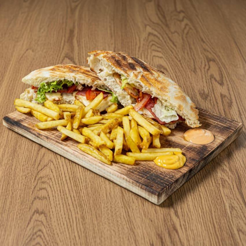 Ζυμωτό καρβελάκι γεμιστό με κοτόπουλο, μπέικον, edam, ντομάτα, μαρούλι & μαγιονέζα. Συνοδεύεται από πατάτες τηγανητές, παρμεζάνα τριμμένη, cocktail sauce & cheddar sauce.