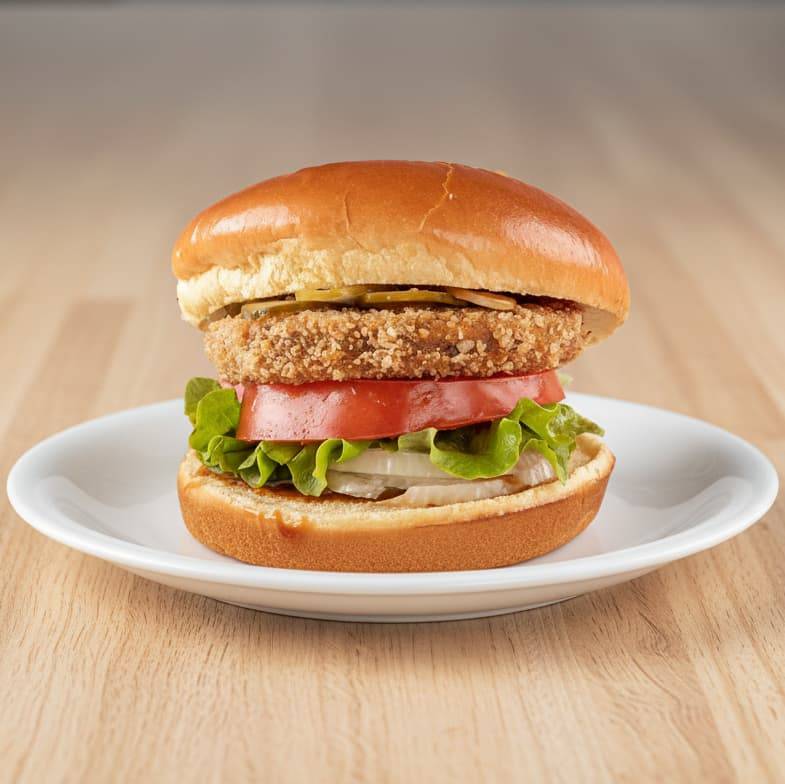 Με μπιφτέκι λαχανικών, τυρί νηστίσιμο, ντομάτα, μαρούλι & BBQ sauce. Συνοδεύεται από πατάτες τηγανητές & cocktail sauce.